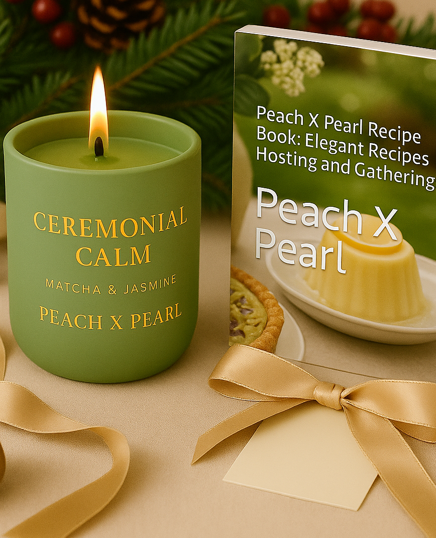 Celebrate the art of calm and connection with the Peach X Pearl Candle Gift Set, featuring two signature creations — the Matcha & Jasmine Candle and the Peach X Pearl Recipe Book.