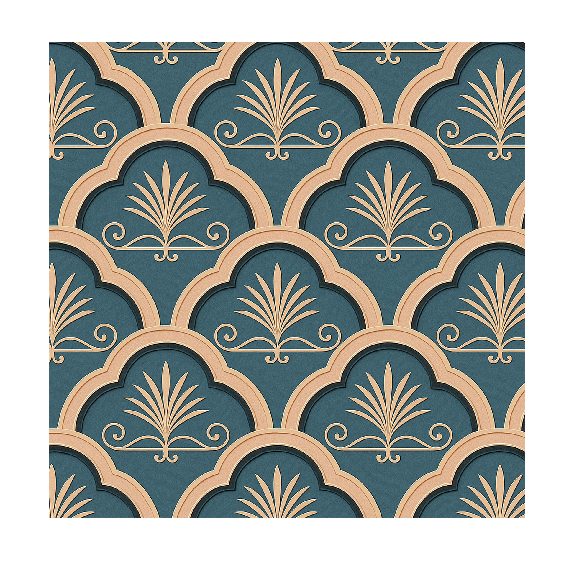 The Palmette Scallop pattern was created to evoke the elegance of boutique hotels and coastal European interiors. The scalloped arches follow a precise architectural rhythm, while the palmette motifs add a soft ornamental touch. The layered detailing and shadow lines give the pattern depth and dimension, making it feel both timeless and modern.