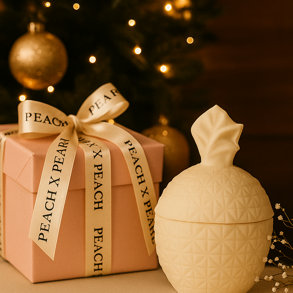 The candle is presented in a beige ceramic glass vessel topped with a sculpted pineapple-pattern lid — a design detail that captures timeless elegance. Each arrives gift-ready in a white box with PEACH X PEARL-branded ribbon, making it the perfect holiday or hostess gift.